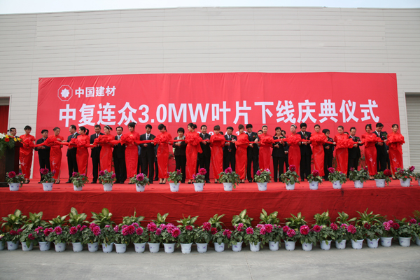 10月18日,連云港中復(fù)連眾復(fù)合材料集團(tuán)的葉片工廠和連云港市文化藝術(shù)中心花團(tuán)錦簇,中復(fù)連眾3兆瓦風(fēng)力葉片下線儀式和20周年慶典隆重舉行。國務(wù)院國資委監(jiān)事會主任陳琦良,國家工信部規(guī)劃司副司長劉樹蘋,國家科技部能源處副處長譚可榮,中國建筑材料集團(tuán)公司總經(jīng)理姚燕,中國建材集團(tuán)外部董事曹德生、王振侯、郭建堂,中國建筑材料聯(lián)合會副會長陳國慶,中國建材報社社長陳才來,中國復(fù)合材料集團(tuán)有限公司董事長張定金,華銳風(fēng)電科技股份有限公司董事長、總裁韓俊良,金風(fēng)科技股份有限公司總裁郭健等參加了3兆瓦葉片下線儀式和中復(fù)連眾成立20周年慶典。